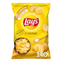 Lay's — чипсы, каждая пачка которых изготовлена из специально отобранного картофеля и соответствует самым высоким стандартам качества. Хрустящие золотистые чипсы Лейс С солью — это отличное сочетание натурального отборного картофеля, растительных масел и соли. Каждый день вкуснее с Lay's. 100% натуральный нарезанный картофель. Качественные ингредиенты. В составе картофель, растительные масла и соли.